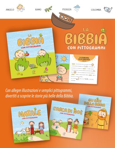I quattro libri illustrati Natale con pittogrammi, La Bibbia con pittogrammi, L'arca di Noè con pittogrammi e Gli eroi della Bibbia con pittogrammi, appena arrivati in libreria, oltre ad essere particolarmente divertenti, hanno appunto questa peculiarità: l’uso dei pittogrammi diventa un efficace strumento di supporto alla lettura dei più piccoli, che riconosceranno in essi figure di base di personaggi, oggetti e luoghi, andando così alla scoperta della vicenda raccontata dai libri.