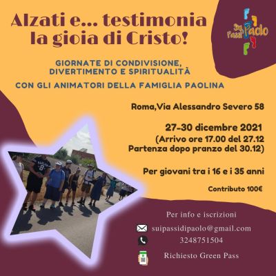 Hai tra i 16 e i 35 anni? A Roma, dal 27 al 30 dicembre, un’esperienza di 3 giorni di condivisione della Parola, ma anche di riflessione, preghiera e gioco pensata per te dagli animatori della Famiglia Paolina...