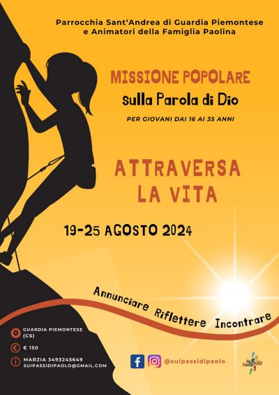 Gli animatori dell’equipe Sui passi di Paolo della Famiglia Paolina ti invitano a partecipare a una missione popolare sulla Parola di Dio a Guardia Piemontese, in provincia di Cosenza, dal 19 al 25 agosto 2024.
